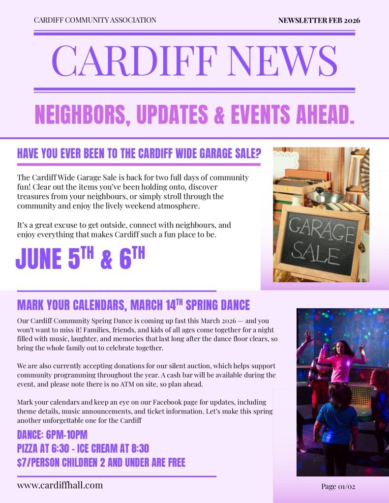 We are a non- profit organization. Our group of community volunteers meet on a bimonthly basis to discuss planning of upcoming events as well as maintenance of our facilities that are the association’s responsibility. The community of Cardiff boasts a Community Hall, 2 ball diamonds, soccer fields, multi-sport court, skating rink, playground and more!